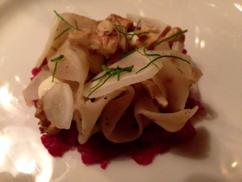 Sotad tartar av innanlåret. Serveras med Nobis-dressing, rostade valnötter, picklad morot och tunt skivad, talgsotad rotselleri.