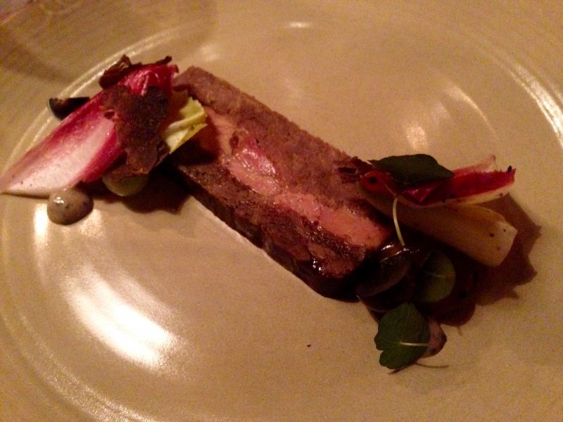 Bogen och läggen som terrine bunden i halstrad marinerad anklever. Serveras med karamelliserad tryffelgrädde, druvor, endive i tryffel-vinaigrette och indiankrasse.