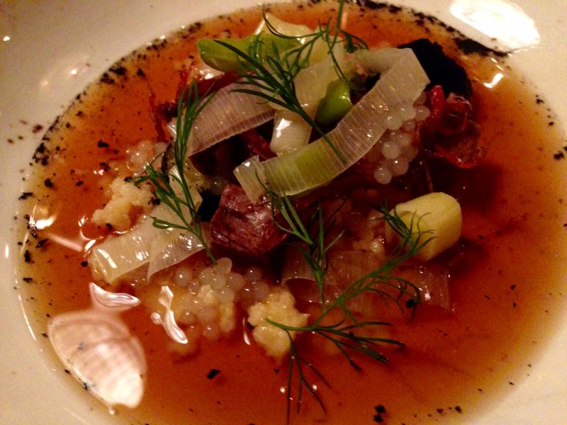 Den i mitt tycke svagaste rätten under kvällen. Och att använda ordet ”svag” är inte rättvist. Det är en bra rätt. Smakerna är bra, absolut. Men – och det här är mitt men – jag har ett litet problem med Djurets buljonger. De är FÖR koncentrerade – och det här går tillbaka löpande genom de senaste gångerna jag har käkat där. De smakar för mycket, de är för kollagenstinna. Jag blir både smakchockad och kladdig i munnen. Det skulle lätt kunna åtgärdas med en liten touch av syra i buljongen, det skulle göra den lättare att ta till sig. Eller kanske bara lite vatten för att späda ut den. Det fanns såklart syra i rätten; i bogen och även i den smulade gräddfilen (häng av länge, torka i ugn och smula). Men inte riktigt nog mycket för mig.