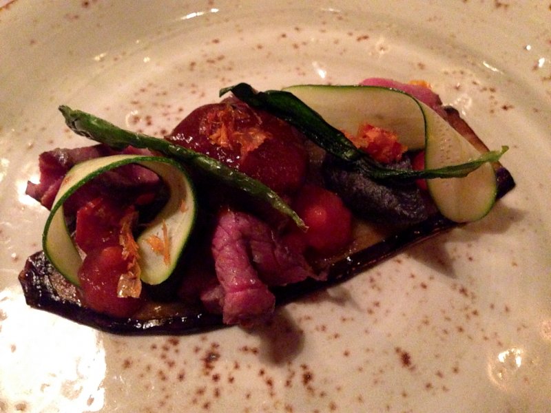 Rostbiffen bakad sous vide 53 °C och bräserad kind. Serveras med citronbakad aubergine, bakad tomat, ramslök och hyvlad zucchini.