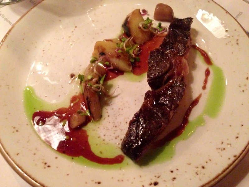 Tillsammans med testiklarna kvällens rätt. Perfekt stekt lammytter, fettkappan var knaprig och om jag inte visste vad det var för kött så hade jag enkelt kunnat tro att det var ankfilé. Tomatkrämen var lysande, spetskålen hade en skön stuns och hallontonerna från rödkålen tillsammans med hallontonerna som finns naturligt i den bakade tomaten var toppen. En perfekt lammjuice till det.