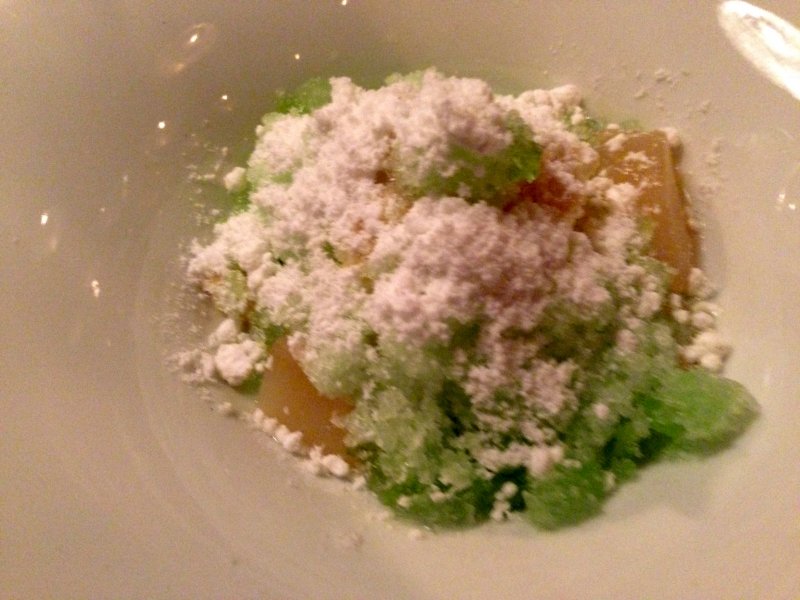 Brödserveringen var som vanligt lysande i sin enkelhet. Amisen var en kall äpplemust med riven lammlägg (tror jag det var). Rent, fräscht gott och sensomrigt. Till detta en liten sudd brioche och lite knäcke med brynt smör och lammtalg. Perfekt.