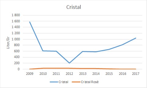 Det är inte varje år det säljs 1200 flaskor, men nu är vi i slutet av en högkonjunktur och 2008 är en haussad årgång, så man vet inte!Såhär mycket Cristal har sålts de senaste åren. 2009 och 2017 har det varit mer än 900 liter (=1200 flaskor).