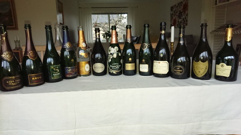 Topp tre av kvällens Champagner var enligt mig. Salon som etta och Krug som tvåa. Dessa spelade i en helt egen division, klart bästa jag druckit någonsin. Några hade Krug som etta och Salon som två men alla var rörande överens om att dessa två var klart bäst. Som trea hade jag Sir Winston. Har provat den minst sex gånger senaste åren och den leverarar varje gång. Kul var att samtliga flaskor levererade och att ingen var trött eller dålig. Lite surrealistisk att betyger på den "sämsta" Champagnen blev 90 poäng, vilket en vanlig kväll hade varit en vinnare.