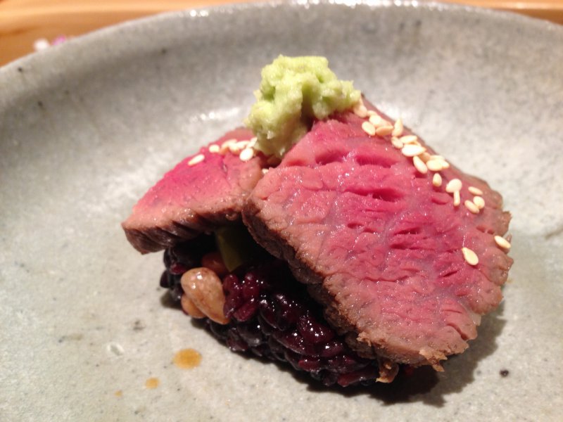 Kvällens sushivarant: perfekt tillredd WAGYU på en kudde av klibbigt rött ris och specialtillredda pinjenötter av utomjordisk kvalitet.