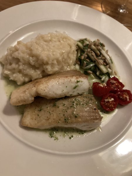 Visa bifogad bild 33139Stekt hälleflundrafilé med citronrisotto, zucchini- och ruccolasallad, basilikabuljong och ugnsbakade tomater med vitlök.