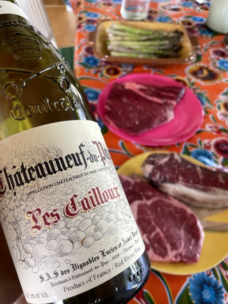 Det grillades kött - svensk Entrecote - svensk flankstek och sen någon spansk, hängmörad ryggbiff med kappa. Allt väldigt gott. Entrecoten var ganska tunt skuren, förde tankarna till Frankrike och en klassisk bistro. Då kändes även franskt vin bra. Varför inte en Châteauneuf-du-Pape!