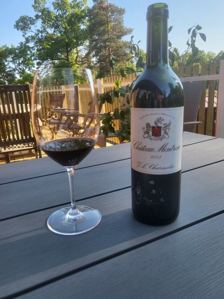 Chateau Montrose 2003. Första flaskan från primörköp, kändes dags att känna på. I början sluten och rätt sträv, men efter ett tag kommer animaliska toner fram, stall, kött och med det en dos multna löv. Mörka bär som mer drar åt björnbär än svarta vinbär. Väldigt gott och efter 2 h i glaset börjar det anas att vinets topp inte ligger alltför långt i framtiden (men det håller många många år än). Fantastiskt bra vin, en av de bästa Bordeauxer jag druckit senaste året. Visst finns det värme i vinet, men det är inget som stör. Montrose har lyckats fantastiskt med årgången, och idag är det 98 p men vete katten om det inte i sina bästa stunder kan tangera 100poängsstrecket. Måste dricka mer Bordeaux helt enkelt.