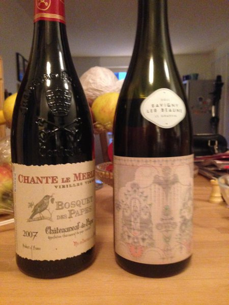 Dålig bild - (telefon å jag skäms).. det står "2011 Le Grappin - Savigny les beaune...typ..Ser inte vad det står på bilden, men chark låter trevligt och annorlunda för ett vitt vin.CdP'n är säkert trevlig också men har inte provat.