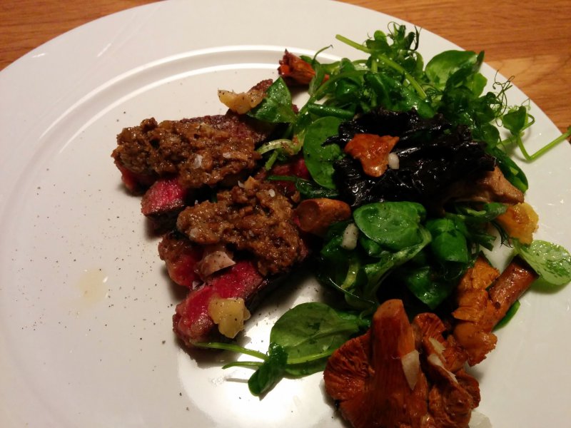 Hällstekt svensk hängmörad biff med svampsallad och karljohancréme