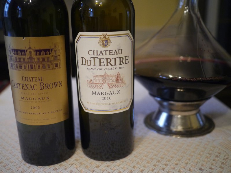Lite Margaux ikväll: Cantenac Brown 2003 och Du Tertre 2010. Skulle jag ha provat de här två blint så finns det inte en chans att jag skulle ha satt dem i samma distrikt, knappast ens som två Bordeaux. Du Tertre 2010 har massor med frukt och kraft i ett snyggt paket, faten och tanninerna sitter där de ska, men det finns inte mycket Cab Sav i det här vinet, initialt kändes det mest som en syrah, med lite tid växte merloten och den fick en del drag av en Pomerol. Cantenac Brown 2003 var lätt och fräsch, oväntat med tanke på året, lite spretig kanske, med drag av furuplankor, sågspån och nyöppnade cigarettpaket. Med lite luft kom det både rosor och violer bland cigaretterna - en del grön paprika och hade någon sagt att det var en bra Chinon så skulle jag ha gått på det. Båda var bra på sitt sätt: Du Tertre har framtiden för sig, medan Cantenac Brown är det perfekta vinet för den som gillar att tugga på blyertspennor och röka samtidigt.