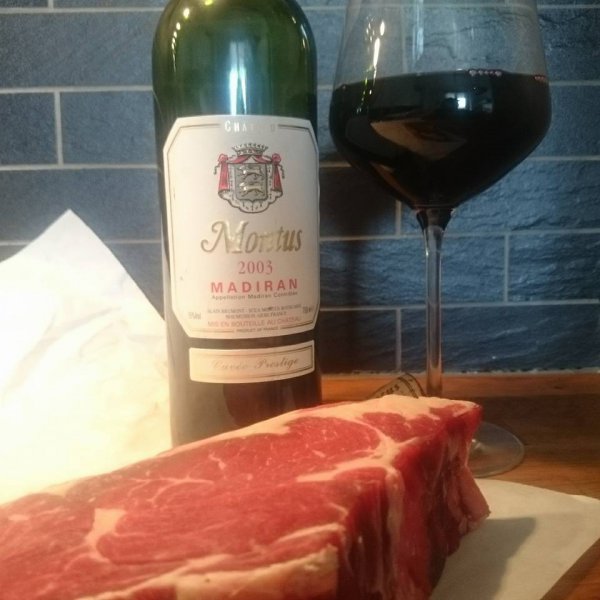 Jag hoppas du drog i dig hela biffen själv. Ser riktigt god ut!Kocken är ledig idag från jobbet och bjuder sig själv på 500G skiva entrecote och en flaska Montus 2003 cuvee prestige. Har druckit flera Montus genom åren och har några olika årgångar kvar i lagringskåpet blev förälskad i Montus för över tio år sedan och har sedan dess köpt på mig olika årgångar genom åren. Just denna råkade jag ha hemma för konsumtion och tänkte att den skulle passa bäst till lunchen.