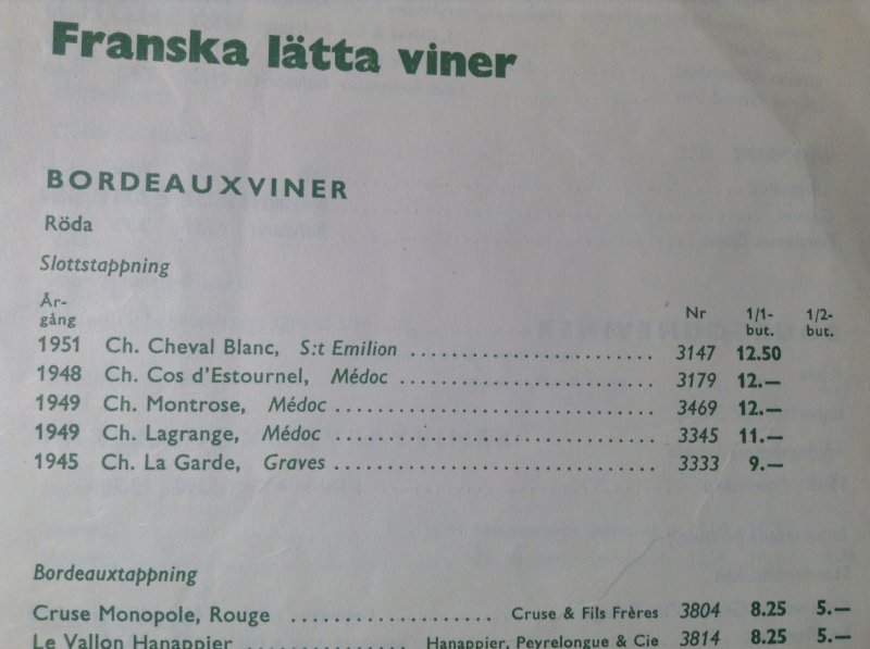 Från 1956. För att få priserna i dagens värde ta x12,5, dvs ca 150 kr för en Ch. Cheval Blanc.
