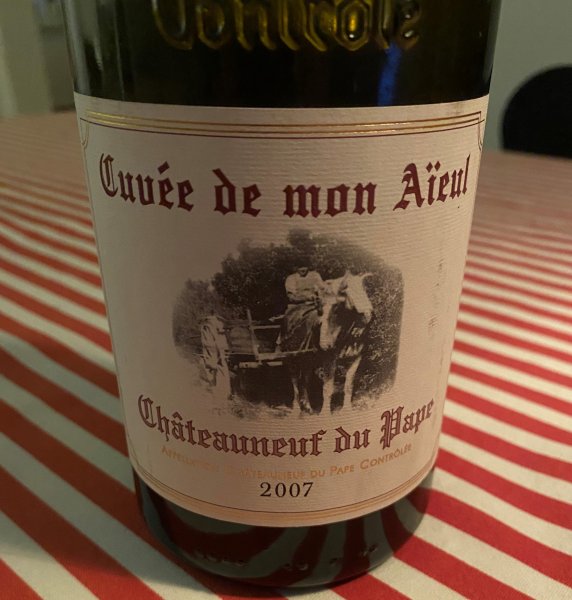 2007 Domaine Pierre Usseglio & Fils, Châteauneuf-du-Pape ”Cuvée de mon Aïeul” har en härligt fin och klar rubinröd färg. Doften börjar som en karikatyr med mängder av garrigue, herbs de provence, bränd jord, saltlakrits och våt disktrasa. Som ett skolboksexempel. Med tiden i glaset kommer det alltmer fruktiga aromer av hallon och jordgubbar samt lavendel och exotisk kryddbasar. Läder, torkat kött och lite tjära men frukten ligger hela tiden ovanpå och dominerar. Galet läckert och nästan svårt att ta näsan ifrån glaset.