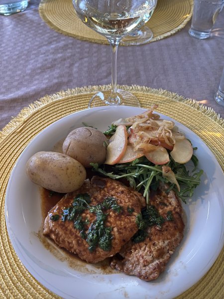 Stekt 2-3 min på vardera sida och sen några minuters vila. Serverade med kokt potatis, stekt lök och äpple på en bädd av ruccola, samt sky från alltihopa med krusiga blad persilja som alltid gör sig perfekt till husman. Persiljan åkte med i skyn av bara farten, men hade nog gjort sig bättre som sista touchen över allt. Matchas med Katarina Wechsler Riesling Trocken 2023.