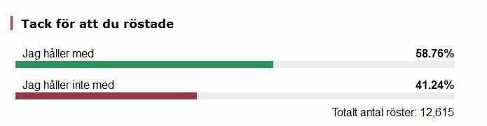 Om jag känner Aftonblaskan rätt så har de omröstningen så att de själva vet hur de skall ta ställning, eftersom de saknar egen ryggrad så svänger de dit massan är - så räkna med att de försiktigt (trots allt bara 59%) kommer att ha FLER artiklar som är positiva till rätt till parallellimport, eller i allafall inga fler artiklar som talar emot frågan.Det kan ju spela roll att många försvarar Systembolaget på Aftonbladets Facebook eftersom tidningen är socialistisk, men samtidigt är det intressant att när det gäller röstningen i själva artikeln där nästan 59 procent av läsarna håller med skribenten om att avskaffa Systembolaget så det kanske är så att Socialdemokrater, MP:are och Vänsterpartister hänger mer i Sociala medier, under tiden tidningens läsare är av mer blandad rang från både vänstern och högern.