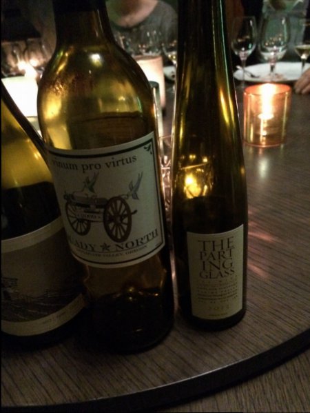 Parting Glass 2013 Gewürtztraminer, inte så druvtypiskt (i positiv bemärkelse), med rimligt hög syra, röda äpplen och mogen exotisk frukt. Hisnande 225 gram restsocker eller något liknande men den höll ändå stilen, i sin kategori.