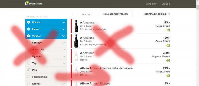 När jag letar i sortimentet, utan att veta exakt vad vilket vin jag kommer att välja vill jag ha en bra översikt och slippa scrolla som en idiot. Jag vill även att så mycket information som möjligt skall vara tillgängligt utan att jag behöver klicka och lämna översiktslistan.