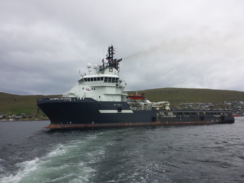 Med pittoreska färöiska byar i bakgrunden lämnar vi gamle Octopus bakom oss i fjorden...